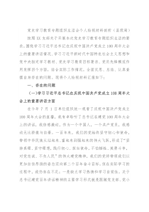 党史学习教育专题组织生活会个人检视材料剖析(县级局)按照XX支部关于开展本次党史学习教育专题组织生活的要求,围绕学习习近平总书记在庆祝中国共产党成立100周年大会上的重要讲话情况、学习习近平新时代中国特色社会主义思想和党中央指定学习教材、党史学习教育目标要求、党