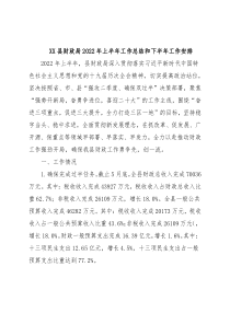 XX县财政局2022年上半年工作总结和下半年工作安排2022年上半年,县财政局深入贯彻落实习近平新时代中国特色社会主义思想和党的十九届历次全会精神,切实提高政治站位,坚决按照省、市、县“强攻二季度、确保双过半”决策部署,聚焦“强势开新局,