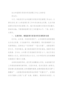 在全市招商引资签约项目清理工作会上的讲话同志们:今天,市政府召开全市招商引资签约项目清理工作会议,主要任务是:深入分析招商引资工作中存在的突出问题,扎实开展招商引资签约项目清理工作,强力促进招商引资签约项目履约、落地和实施,不断提高招商引资工作质量和水平。下面,我讲三