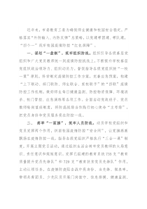场当作践行初心使命“主考场”,把党员身份和党员服务亮在防控一线。二、高举“一面旗”,筑牢人员防线。动员学校党组织和党员发挥两个作用,织密校园疫情防控“安全网”,让党旗高高飘扬在疫情防控一线。指导各级党组织严格执行“三会一课”制度,开展主题党日活动,通过组织生活会树牢党员教师的大局意识、责