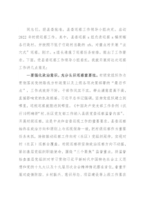 ,不断加强党对农村工作的集中统一领导,打通全面从严治党“最后一公里”。x镇和各行政村要站在讲政治的高度,充分认识村级巡察的重大意义,以巡察为契机,深刻认识“两个确立”的决定性意义,进一步增强“四个意识”、坚定“四个自信”、做到“两个维护”。二要强化