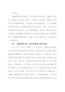 同志们:金融是现代经济的核心,是实体经济的血脉。金融活,经济活;金融稳,经济稳;经济兴,金融兴;经济强,金融强。保持经济的平稳健康发展,加快推动XX高质量发展,一个非常重要的前提和基础,就是要把金融工作抓实抓好。刚才,相关部门和金融机构代表的发言,谈了很多前瞻