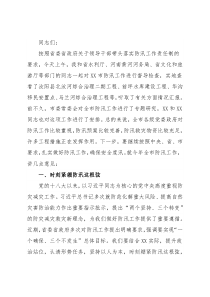 同志们:按照省委省政府关于领导干部带头落实防汛工作责任制的要求,今天上午,我和省水利厅、河南黄河河务局、省文化和旅游厅等部门的同志一起对XX市防汛工作进行督导检查,实地查看了汝阳县北汝河综合治理二期工程、前坪水库建