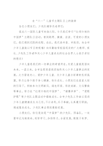 在“六一”儿童节主题队日上的致辞各位小朋友们,少先队辅导员老师们:值此六一国际儿童节来临之际,今天我们举行“红领巾相约中国梦”主题队日活动,看到聪明、健康、活泼、可爱的小朋友们,我们感到无限的欣慰。在此,我代表市委、市政府,
