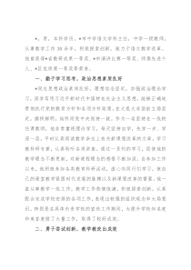*,男,本科学历。*市中学语文学科主任,中学一级教师,从事教学工作30余年,积极探索创新,致力于语文教学改革。他曾获得*省教研成果一等奖、*市演讲比赛一等奖、师德先进个人、*区优质课一等奖等荣誉。一、勤于学习思考,政治思想素质良好*同志