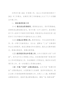 为更好开展2022年党建工作,结合公司实际情况制定了2022年工作要点,在做好日常工作的基础上从以下几个方面重点开展工作:一、落实集团党委工作(一)强化政治思想教育。提高政治站位,筑牢思想基础,坚持把政治建设摆在首位,每月开展一次中心组学习,落实理论学习中心