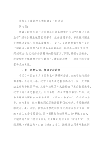 在加强土地管控工作部署会上的讲话同志们:市政府即组织召开这次规格比较高的推广X区“网格化土地监管”经验加强土地管控部署会,充分说明市委、市政府对国土资源执法监察工作的高度重视。一会儿,X还要就如何推广X区“网格化土地监管”典型经验做重要讲话,我们务必要认真学习,深刻领会,切实抓好会议精