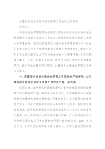 交警队长在全市校车安全管理工作会议上的讲话同志们:市校车安全管理联席会议研究,召开今天这次全市校车安全管理暨中小学幼儿园安全工作会议,对我市校车安全管理工作进一步部署安排,是我们贯彻落实《校车安全管理条例》和《X省人民政府办公厅关于加强校车安全管理工作的通知》,确保广大中小学生幼儿园学生上下学