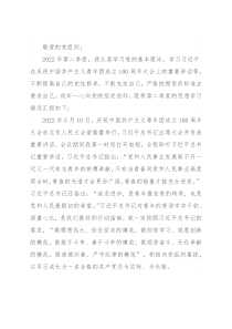 敬爱的党组织:2022年第二季度,我认真学习党的基本理论,学习习近平在庆祝中国共产主义青年团成立100周年大会上的重要讲话等,不断提高自己的党性修养,不断充实自己,严格按照党员标准去要求自己,筑牢一心向党的坚定信仰,现将第二季度的思想学习情况汇报如下:2022年5月10日,庆祝中国共产主义青年团成