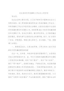 在全县政府系统廉政工作会议上的讲话同志们:这次会议的主要任务是,以习近平新时代中国特色社会主义思想为指导,深入贯彻落实国务院和省人民政府廉政工作会议、市政府廉政工作会议和县纪委全会精神,全面总结2020年全县政府系统廉政建设和反腐败工作,安排部署2021年政府系统廉政建设和反腐败工作,