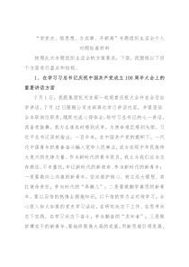 “学党史、悟思想、办实事、开新局”专题组织生活会个人对照检查材料按照此次专题组织生活会的方案要求,下面,我围绕以下四个方面进行盘点和检视。1、在学习习总书记庆祝中国共产党成立100周年大会上的重要讲话方面7月1日,我跟集团机关支部一起观看庆祝大会并在会后自学讲话,7月12日跟随公