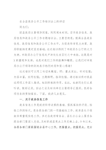 在全县政务公开工作培训会上的讲话同志们:经县政府主要领导同意,利用周末时间,召开政务信息、政府信息和政务公开工作专题培训会。主要目的是:提高全县政务信息、政府信息和政务公开工作水平,为促进科学民主决策、政府职能转变奠定坚实基础。这次培训得