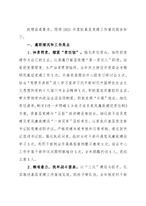 按照县委要求,现将2021年度抓基层党建工作情况报告如下:一、履职情况和工作亮点1.知责明责,绷紧“责任弦”。强化责任担当,始终把党建作为自己的主业,认真履行基层党建“第一责任人”职责,自觉把党要管党、从严治党贯穿始终。全年共主持召开党委会专题研究基层党建工作X次,开展党委理论中心组学习研讨