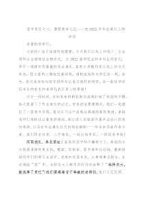 坚守责任之心,勇担使命之任——在2022年毕业典礼上的讲话亲爱的同学们:大家好!由于疫情防控需要,今天我们以线上和线下、主会场和分会场相结合的方式,为2022届研究生和本科生同学们,举行一场简朴而隆重的毕业典