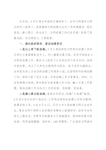 宣传栏、LED屏幕等,广泛宣传文明城市和文明单位创建工作,让“人人都是参与者、人人都是创建者”的理念深入人心。三是党建引领抓创建。出台《中共X市X局党组“党建+文明创建”工作实施方案》,建立“党建+文明创建”工作机制,将党的领导贯穿到创建工作的各方面