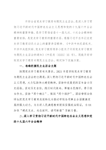 育专题民主生活会的主题是:深入贯彻习近平新时代中国特色社会主义思想,大力弘扬伟大建党精神,坚持和发展党的百年奋斗历史经验,坚定历史自信,践行时代使命,厚植为民情怀,勇于担当作为,坚持“两个确立”、做到“两个维护”,团结带领全体师生把党史学习教育成效转化为推动学校各项事业全面健康发展的