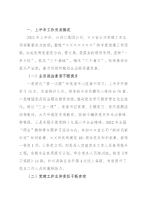 一、上半年工作完成情况2022年上半年,公司以集团公司、××省公司党建工作各项部署要求为统领,围绕“×××××××”的年度党建工作思路,切实发挥党委把方向、管大局、促落实的领导作用,坚持“一条主线”,抓实“三个基础”,强化“六个着力”,纵深推进全面从严治党,着力引领和推