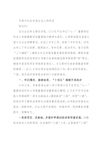 市委书记在市委全会上的讲话同志们:这次会议的主要任务是,以习近平总书记“七一”重要讲话和来X考察重要讲话重要指示精神为指引,认真贯彻落实省委X届X次全会部署要求,总结上半年工作,安排下半年任务,动员全市上下守正创新、接续奋斗,有知