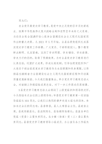 题,以昂扬姿态继续奋力全面建设社会主义现代化国家新征程和开创高质量发展新局面。今天我们隆重集会,举办党史学习教育总结大会,对前期工作做经验成果总结,对下一步工作再动员再部署。X县党史学习教育总结大会得到了上级党组织和领导的关怀,今天莅临本次会议的上级领导有:市委党史学习教育第一巡
