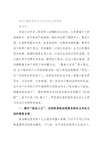 排,以更大的力度、更实的举措深入推进重要领域和关键环节改革,推动工作高质量发展。特别是对于今年的X个重点项目,要克服万难、全力以赴加以推进。我多次说过,局机关一个重要职责就是把基层好的创新实践总结推广好。每名局机关的干部都要牢固