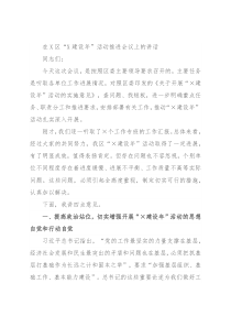 部署有关工作,推动“×建设年”活动扎实深入开展。刚才,我们逐一听取了×个工作专班的工作汇报。总体来看,经过大家的共同努力,我区“×建设年”活动取得了一定进展,有了明显成效,值得表扬肯定。但存在问题也不容忽视,个别单位不同程度存在着进度缓慢、进展不平衡、工作质量