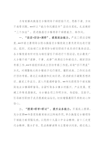 风。“帮”字见实效。指导乡镇党委建立新老班子成员“帮带”机制,发挥“老带新”“传帮带”作用,在巩固脱贫攻坚成果、疫情防控、防火防汛、招商引资等重点工作上实现无缝衔接、有效推进,促进新班子成员履职能力和工作业绩“双提升”。“考”字促成绩。严
