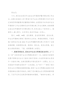 同志们:今天,我们在这里召开全县生态环境保护暨河湖长制工作会议,主要任务是深入学习贯彻习近平生态文明思想和习近平总书记来陕西考察重要讲话重要指示精神,全面落实中央和省市生态环境保护工作会议精神及省市河湖长制工作会议精神,安排部署全县生态环境保护及河湖长制工作,动员全县上下坚定信心,趁势而上,凝