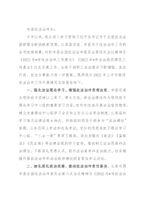 治政府建设工作要点》扎实开展工作,全体干部职工法治意识不断增强,依法行政、依法办事能力进一步提高,现将我办2022年上半年推进依法治市工作开展情况总结报告如下。一、强化法治理论学习,增强依法治市思想自觉。市委巡察办领导班子坚持以上率下、带头示范,将法治理论作为领导