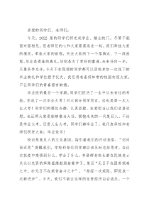 亲爱的同学们、老师们:今天,2022届的同学们将完成学业、踏出校门。尽管不能面对面相见,但老师们的心和大家紧紧连在一起。我们牵挂大家的境况,牵挂大家的前程,关注大家的下一个落脚点、下一段旅程。毕业是青春的典礼,送别