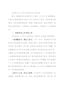在2021年上半年工作讲评会上的讲话刚才,局属各单位主要负责人汇报了上半年工作,都很精彩。X局长代表局党组对全局上半年工作进行了讲评,总结成绩全面客观,分析问题实事求是,布置工作重点突出,我完全赞同,请同志们深刻领会,认真落实。在此基础上,我再讲三个方面的意见:一、客观评价上半年的工作总的来