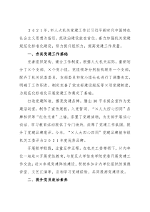 2021年,市人大机关党建工作以习近平新时代中国特色社会主义思想为指引,把政治建设放在首位,着力加强机关党建规范化标准化建设,努力提升组织力,提高党建工作质量。一、夯实党建工作基础完善组织架构、健全工作制度。根据人大机关实际,重新划分了×个支部、×个党小组,党组领导分别挂钩联系一个支部,配