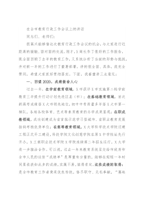 贯彻落实。下面,我着重讲三点意见:一、回望2020,成绩振奋人心过去一年,在学前教育领域,X市获评X市实施第二轮学前教育三年提升行动计划先进区县(市);在基础教育领域,首次新高考成绩居X大市领先地位,