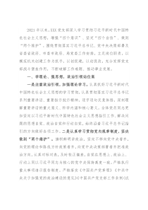 字逐句反复体悟,深刻理解重要讲话的重大意义、科学内涵和核心要义。全体党员同志更加坚定以习近平新时代中国特色社会主义思想指引工作、解决问题的思想自觉、政治自觉和行动自觉,始终沿着习近平总书记指引的方向做好各项工作。二是认真学习贯彻党内规章制度,坚决做到“两个维护”。旗帜鲜明讲政治,坚定不移向党
