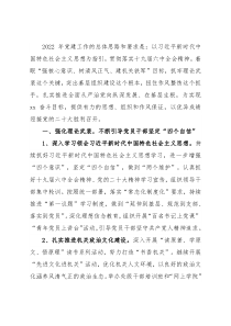 2022年党建工作的总体思路和要求是:以习近平新时代中国特色社会主义思想为指引,贯彻落实十九届六中全会精神,着眼“强核心意识、树清风正气、建机关铁军”目标,抓牢理论武装这个关键,突出基层组织建设这个根本,扭