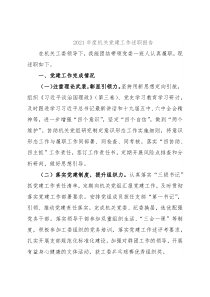 2021年度机关党建工作述职报告在机关工委领导下,我能团结带领党委一班人认真履职,现述职如下。一、党建工作完成情况(一)注重理论武装,彰显引领力。坚持用新思想定向引航,组织《习近平谈治国理政》(第三卷)、党史学习教育学习研讨,及时跟进学习习近平总书记最