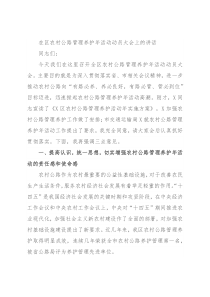 路管理养护活动年实施方案》,X加强农村公路管理养护工作做了安排;市交通运输局X就农村公路管理养护年活动工作提出了要求,我完全同意,请大家会后认真抓好贯彻落实。下面,我再强调三点意见。一、提高认识,统一思想,切实增强农村公路管理养护年活动的责任感和使命感农村公路作为农村最重要的公益性基础设施,对于
