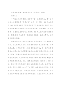 在全市建筑施工质量安全管理工作会议上的讲话同志们:今天的会议开得很好,内容很丰富,主题很突出,整个会议的核心关键词就是“质量安全”这四个字。刚才,XX同志通报了2020年度全市建设工程质量安全工作督查情况,宣读了2021年度全市建筑工程安全生产目标管理考核工作的