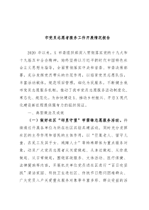 市党员志愿者服务工作开展情况报告2020年以来,X市委组织部深入贯彻落实党的十九大和十九届五中全会精神,始终坚持以习近平新时代中国特色社会主义思想为指导,全面贯彻落实中央和省委、市委决策部署,充分发挥党员带头的示范作用,以培育党员志愿队伍,丰富活动载体,规范