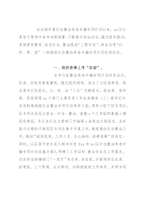 ,着力提升辖区群众特别是老年人的识骗能力和防骗意识。三、工作成效上见“真招”。坚持“行业整治”“地方整治”两条线统筹运行,推进以区委宣传部等x个部门、xx个街镇的整治工作双线互补、协同发力,努力形成“各