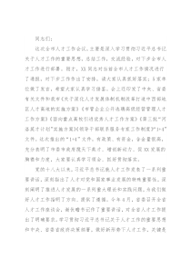 同志们:这次全市人才工作会议,主要是深入学习贯彻习近平总书记关于人才工作的重要思想,总结工作,交流经验,对下步全市人才工作进行部署。刚才,XX同志对当前全市人才工作情况进行了通报,对下步工作作出了安排,请大家认真抓好落实;5家单位做了发言,希望大家认真学习借
