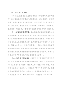 制方法等方面还有待进一步完善,疫情防控、食品药品等领域风险防范化解仍需抓细,风险的预见预判和应对处置有待进一步增强。三、2023年工作思路2023年是全面贯彻落实党的二十大精神的开局之年,县市监局将紧跟县委县政府和上级局的决策部署,全面贯彻落实党的二十大报告中提出的新要求新