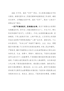 立遵纪守法、艰苦朴素、自食其力的良好观念。党员干部要把家风建设摆在重要位置,廉洁修身、廉洁齐家,在管好自己的同时,管好“身边人”。过节不任性,廉洁一身轻。最后祝大家过一个欢乐、团圆、祥和、廉洁的节日。