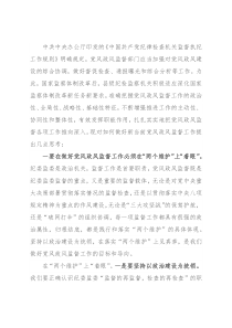 风政风监督工作全过程、各方面,有效防止监督方向走偏、监督内容泛化、监督效果弱化的倾向,充分体现政治监督、纪律监督、作风监督的功能。二是要坚持上下贯通,行动一致。除党章和宪法赋予的监督内容外,我们应当体现“中央有部署,各级有行动