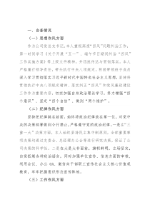 一、自查情况(一)思想作风方面作为公司党总支书记,本人重视高度“四风”问题纠治工作,第一时间学习《关于开展“五一”、端午节日期间纠治“四风”工作实施方案》等上级文件精神,并迅速传达与贯彻落实。本人严格履行领导责任,带头执行中央八项规定,积极带领班子成员深入学习贯彻落实习近平新时代中国