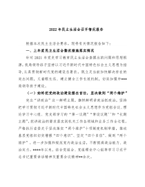 2022年民主生活会召开情况报告根据本次民主生活会要求,现将有关情况报告如下:一、上年度民主生活会整改措施落实情况针对2021年党史学习教育民主生活会查摆出的问题和思想根源,我局领导班子坚持以习近平新时代中国特色社会主义思想为指导,认真贯彻新时代