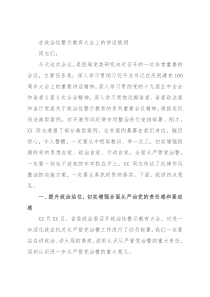 ,全面从严管党治警,一定要一刻也不放松的牢牢抓在手上。XX同志传达了纪律作风整治的实施方案,一定要认真抓好贯彻落实。下面,我讲四点意见。一、提升政治站位,切实增强全面从严治党的责任感和紧迫感XX月XX日,省委政法委召开政治性警示教育大会,对进一步深化政法机关从严管党治警工作进行了动