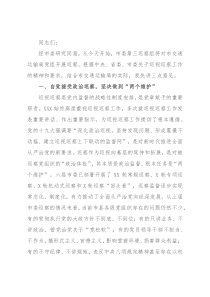 动做到“两个维护”。要以这次巡察为契机,进一步坚持和加强党的全面领导,坚决落实管党治党政治责任,把巡察作为推动本单位改革发展建设的重要抓手,促进市交通运输局党组各项工作不断取得新突破和新成绩。二、围绕“三个聚焦”,突出重点加强政治监督按照中央和省委关于巡视巡察工作部署精神,根据市委要求,