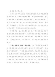 出了新的更高要求,也为政协事业提供了新的更大舞台。我们要携手一起向未来,以奋斗者的姿态、实干者的担当,努力干出新一届政协的新样子。一要忠诚履职,铸就“政协品格”。我们要坚持以XXX新时代中国特色社会主义思想为指导,始终牢记“两个确立