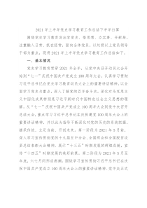 2021年上半年党史学习教育工作总结下半年打算围绕党史学习教育突出学党史、悟思想、办实事、开新局,注重融入日常、抓在经常,面向全体党员,以处级以上党员领导干部为重点,现将2021年上半年党史学习教育工作总结如下。一、基本情况党史学习教育贯穿2021年全年,从党