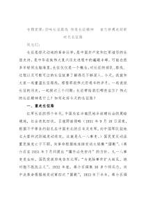 长征故事了解得还不够深入。今天,我就和大家一起重温长征路线,感悟那段伟大而艰辛的岁月,一起说说长征的历史,一起探讨三个问题:长征带给我们哪些启示?伟大的长征精神是什么?如何走好今天的长征路?一、重走长征路红军长征的那个年代,中国处在半殖民地半封建社会的黑暗境地,社